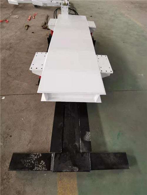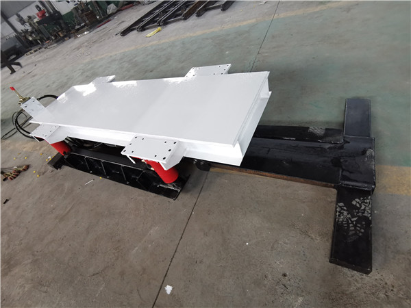 自移式设备列车组通过设置的操纵阀组进行设备列车的前移。自移式设备列车组设备推进时,操作制动装置手柄,将设备列车后端的平板车制动装置打开,使后端平板车处于制动状态,前段平板车制动装置处于待制动状态,操作行走油缸,使行走油缸活塞杆伸出,推动前段车体沿轨道前移,待行走油缸完全伸出后,操作前段车体制动装置手柄,将前移后的平板车制动器打开,同时将后端处于制动状态的车体恢复待制动状态,操作行走油缸手柄将行走油缸活塞收回,后端车体沿轨道前移,前移后后端平板车制动装置打开,完成一次推移动作,依次循环可达到自移式设备列车组随工作面推进工作。