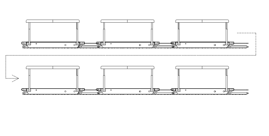 在煤矿综采工作面轨道巷中,乳化液泵站、液箱、变压器、综保、开关等设备都是固定在平板车上,各平板车首尾顺次连接。在最前端和最后端平板车上还要安装绞车,并在巷道地面做生根点。通过绞车带动平板车顺着工作面的推进而向前移动。此种拉移方式,在有上下坡的巷道中,易发生断绳、溜车等事故安全隐患极大。矿用液压移动列车组的使用能彻底改变传统的拉移方式并能实现自锁,从而确保煤矿生产安全。因此,在多级排列的设备列车布置的情况下,设计一种能够具有自移功能的设备列车,代替绞车的牵引方式,是非常有必要的。